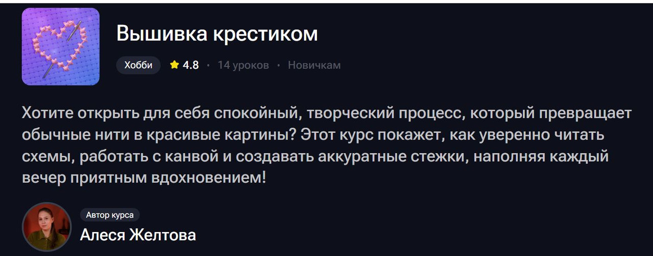 14 занятий с Алесей Желтовой — это не абстрактные «творческие посиделки» с рассуждениями о прекрасном, а пошаговая система, которая превращает растерянного новичка (это я про крестик или про плюсик?) в уверенного вышивальщика.