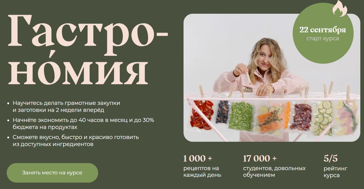 Научитесь делать грамотные закупки и заготовки на 2 недели вперед, вкусно готовить и красиво сервировать. И начните экономить до 40 часов в неделю и до 30% бюджета на продукты.