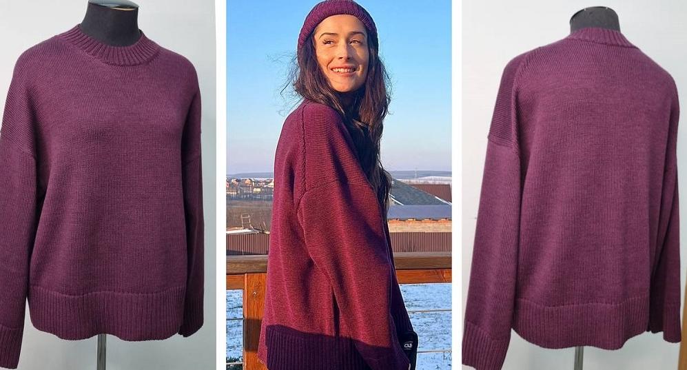 4. Японское плечо отлично смотрится на базовых фактурах: гладь, резинка, полуфанг. На узорных переплетениях может «потеряться» или исказить линии проймы и плеча.