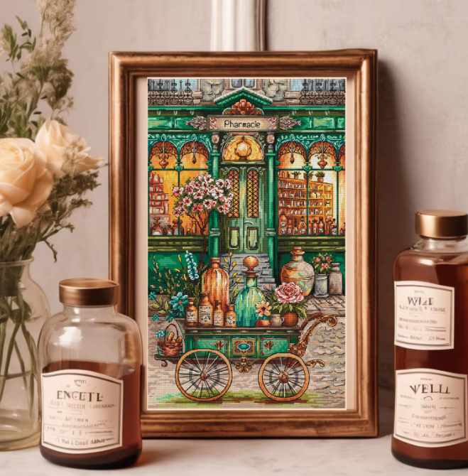 Аптека – Винтажная схема вышивки крестом «Аптекарь», Французская аптечная тележка, Дизайн вышивки «Старинный магазин»