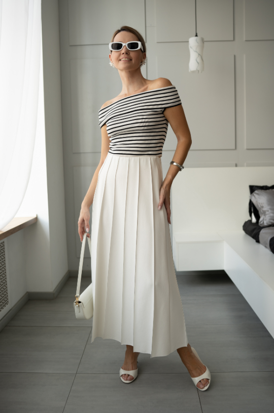 Выкройка юбки из трикотажного полотна, умеренного объема, А-силуэта, со складками. Линия талии — на естественном месте. Пояс на эластичной резинке. Длина изделия — до щиколотки.