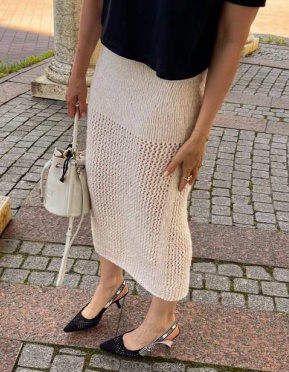 Классическая и универсальная юбка-карандаш, связанная спицами сверху вниз. Модель украшена ажурным узором.