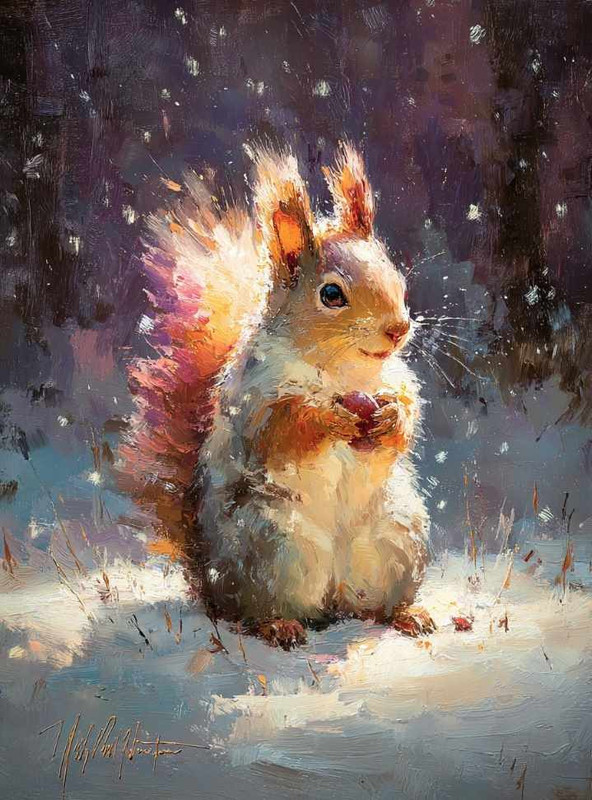 На втором занятии мы напишем один из самых трогательных зимних сюжетов – портрет любопытного бельчонка, сидящего на снегу в зимнем лесу. Создадим живописную картину, где каждый мазок передает пушистость рыжей шерстки, блеск внимательного глаза и очарование этого лесного жителя. Поработаем с выразительным контрастом теплых оранжево-рыжих тонов белки и холодного сине-фиолетового фона заснеженного леса, создавая атмосферу морозного зимнего дня.