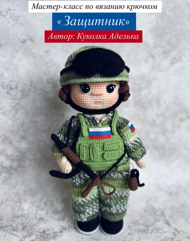 Мастер-класс по вязанию крючком образа военного на Антошку. Содержит текстовое описание и множество фото процесса вязания комбинезона, каски, очков, бронежилета, автомата и гранаты.
