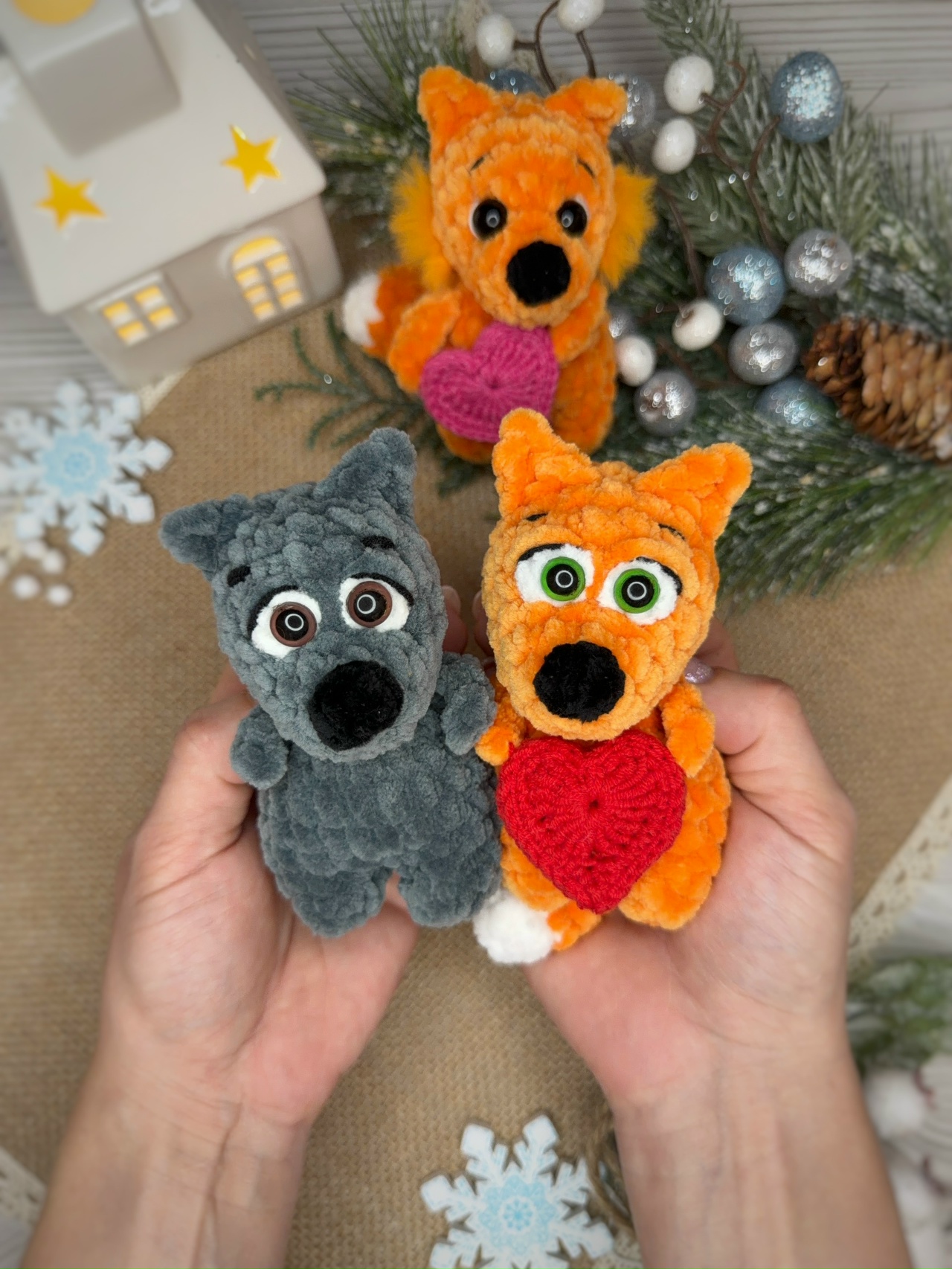 Размер игрушек при использовании указанных материалов примерно 11 см. Размер может отличаться в зависимости от пряжи, крючка, плотности и способа вашего вязания. В мк входит описание лисенка и волчонка.