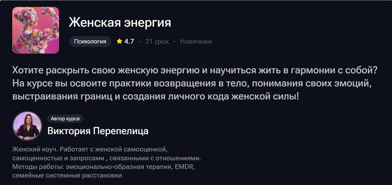 Давайте сразу расставим точки над «ё»: этот курс — не про «наполнение лунной силой», не про «активацию сакральной чакры» и не про то, как стать «богиней» к следующему полнолунию. Виктория Перепелица — практикующий психолог с конкретными методами, а не гуру в развевающихся одеждах с благовониями .