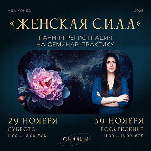Вы приобретаете участие в Трансляции нового двухдневного семинара-практики Ады Кондэ «Женская С.И.Л.А.», который состоится 29-30 ноября 2025.