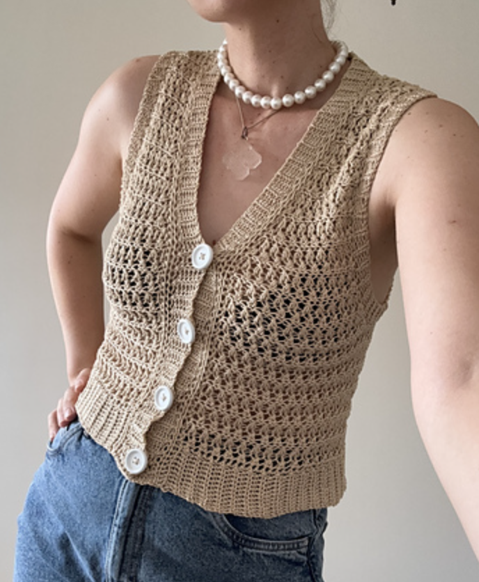 The Aria waistcoat is designed to have approx. 0 – 5 cm of positive ease. The sizes XS, (S), M, (L), XL, (2XL) fit a chest circumference of: 80 – 85; (85 – 90); 90 – 95; (95 – 100); 100 – 110; (110 – 120) cm. Before you start your project, measure yourself with a measuring tape around your bust to determine which size will fit you the best. For example, if you measure 92 cm around your bust, you should make a size M with a finished measurement of 94 cm, which will give you 2 cm of positive ease.