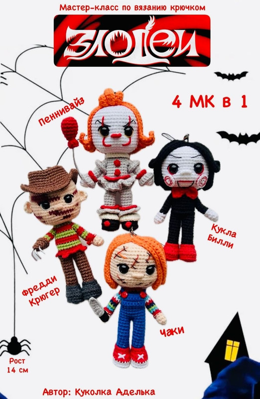 Сет из 4х мастер-классов по вязанию брелочков «Кукла Билли», «Пеннивайз», «Кукла Чаки», «Фредди Крюгер>>